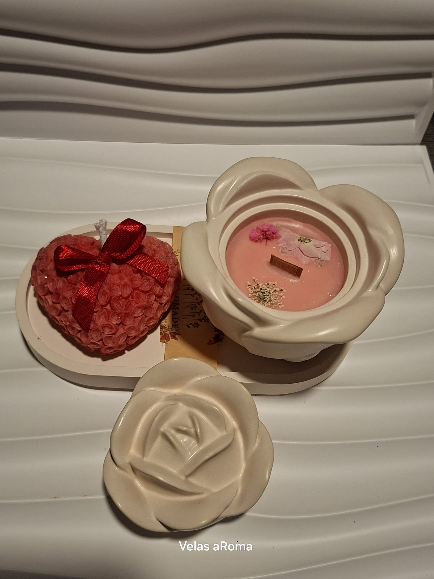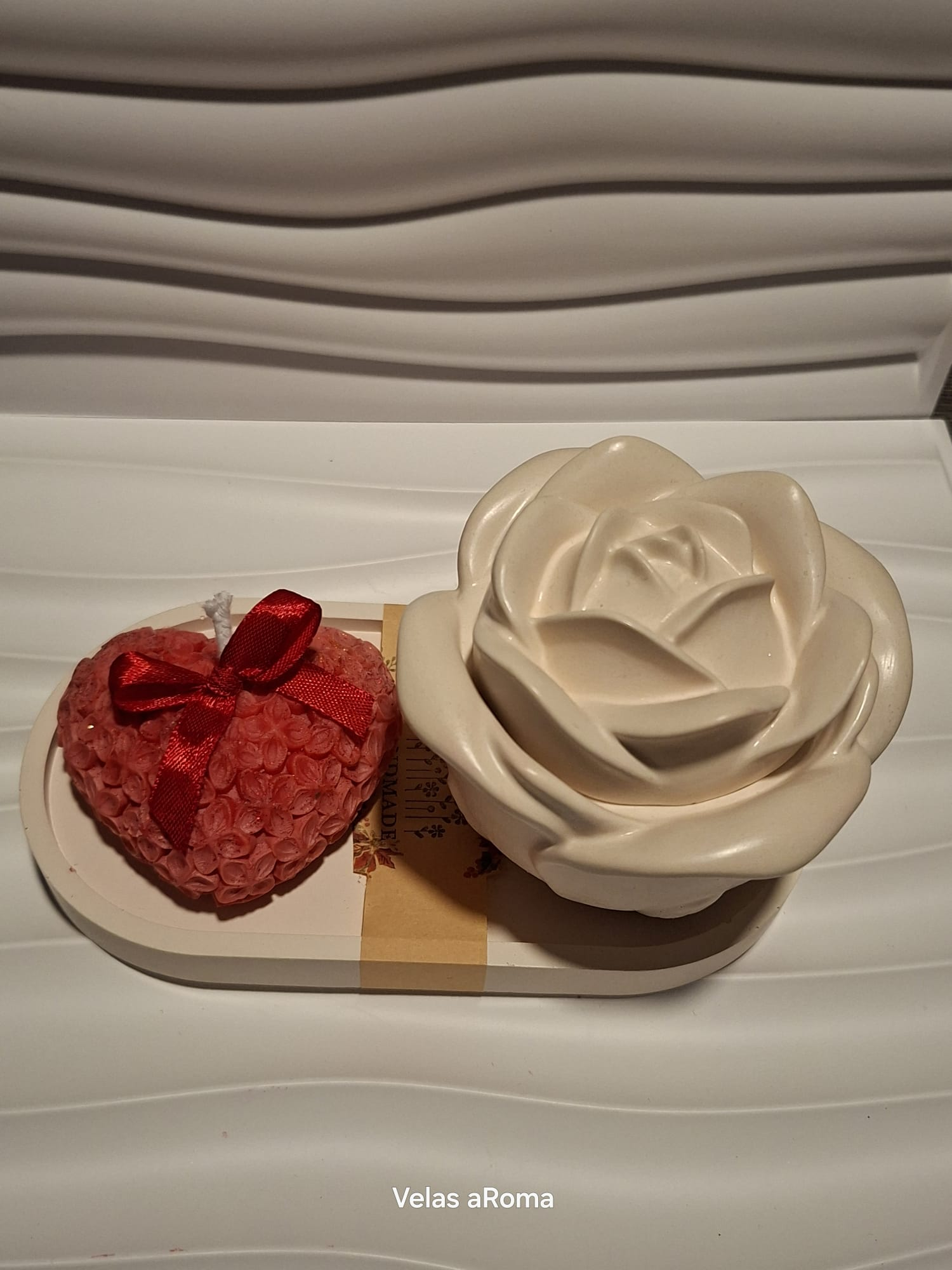 Este conjunto especial combina una vela aromática artesanal en envase decorativo, una bandeja a juego y una vela con forma de corazón, creando una pieza única pensada para regalar y emocionar.