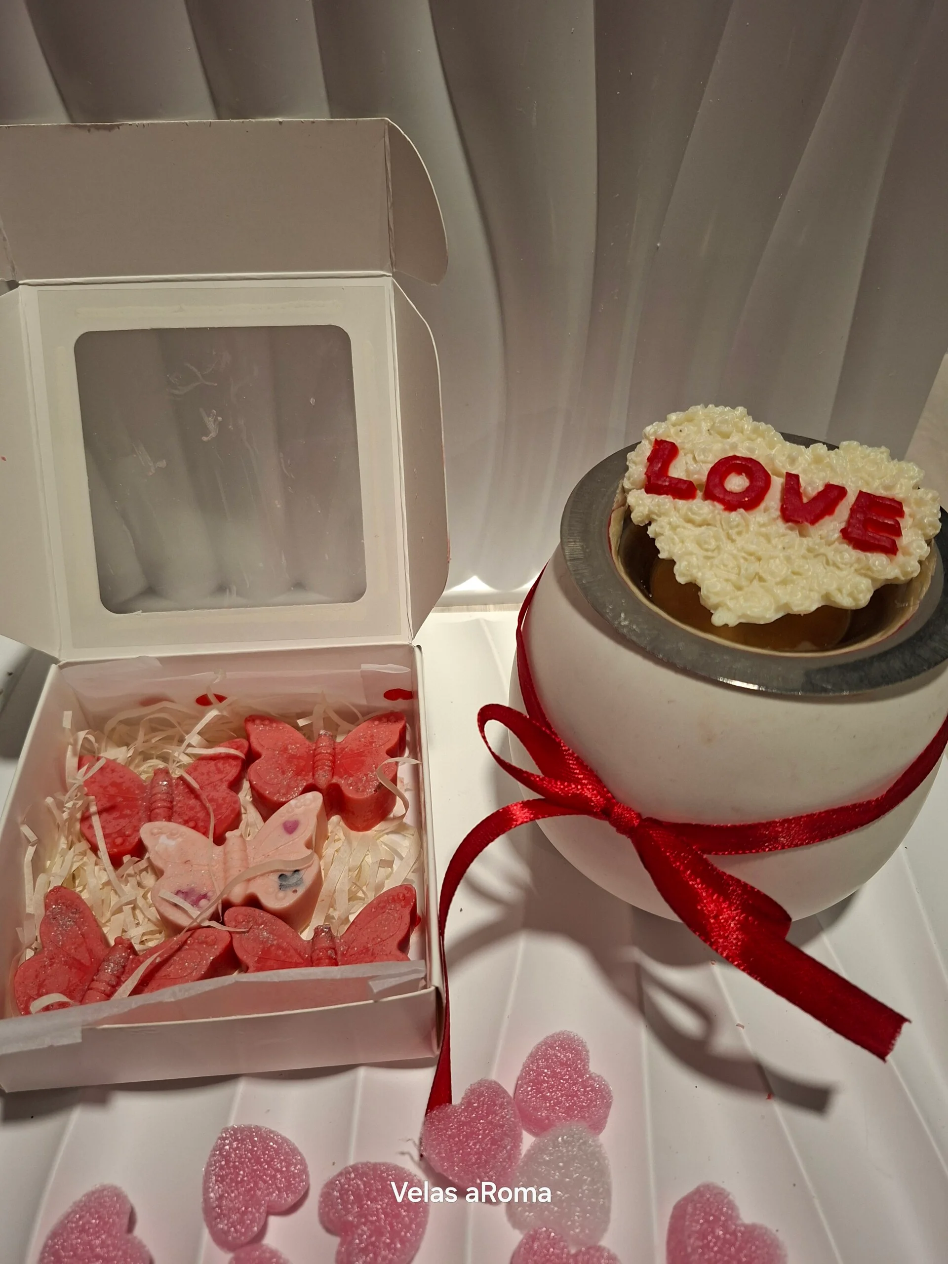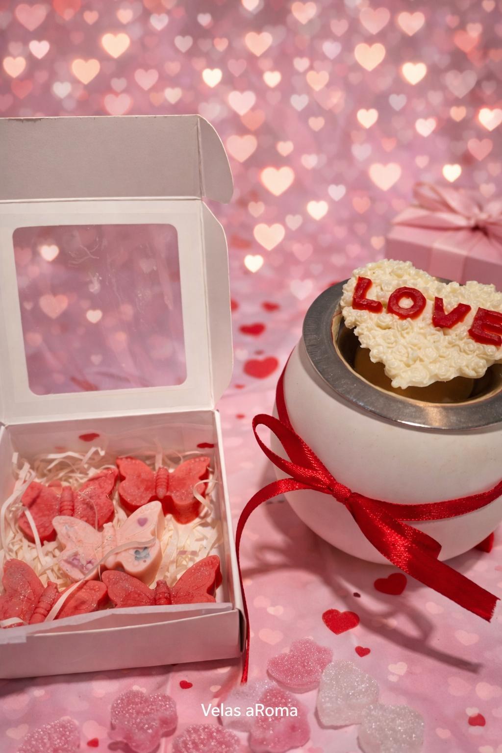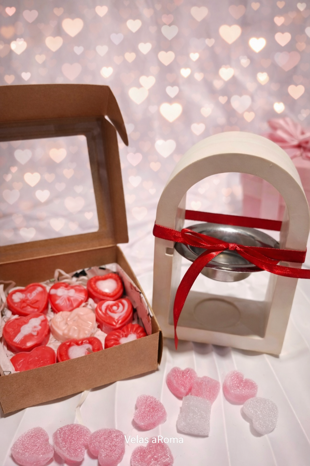 Caja de Corazones Aromáticos (Wax Melts): Una selección de bombones de cera en forma de corazón, vertidos a mano con los aromas más dulces y románticos de nuestra colección.