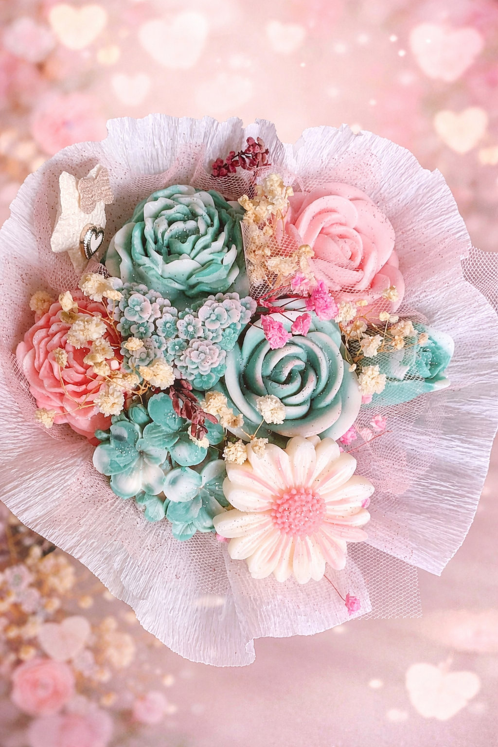 Este delicado ramo de wax melts artesanales combina flores en tonos suaves y románticos, creando una pieza única que perfuma y decora al mismo tiempo.