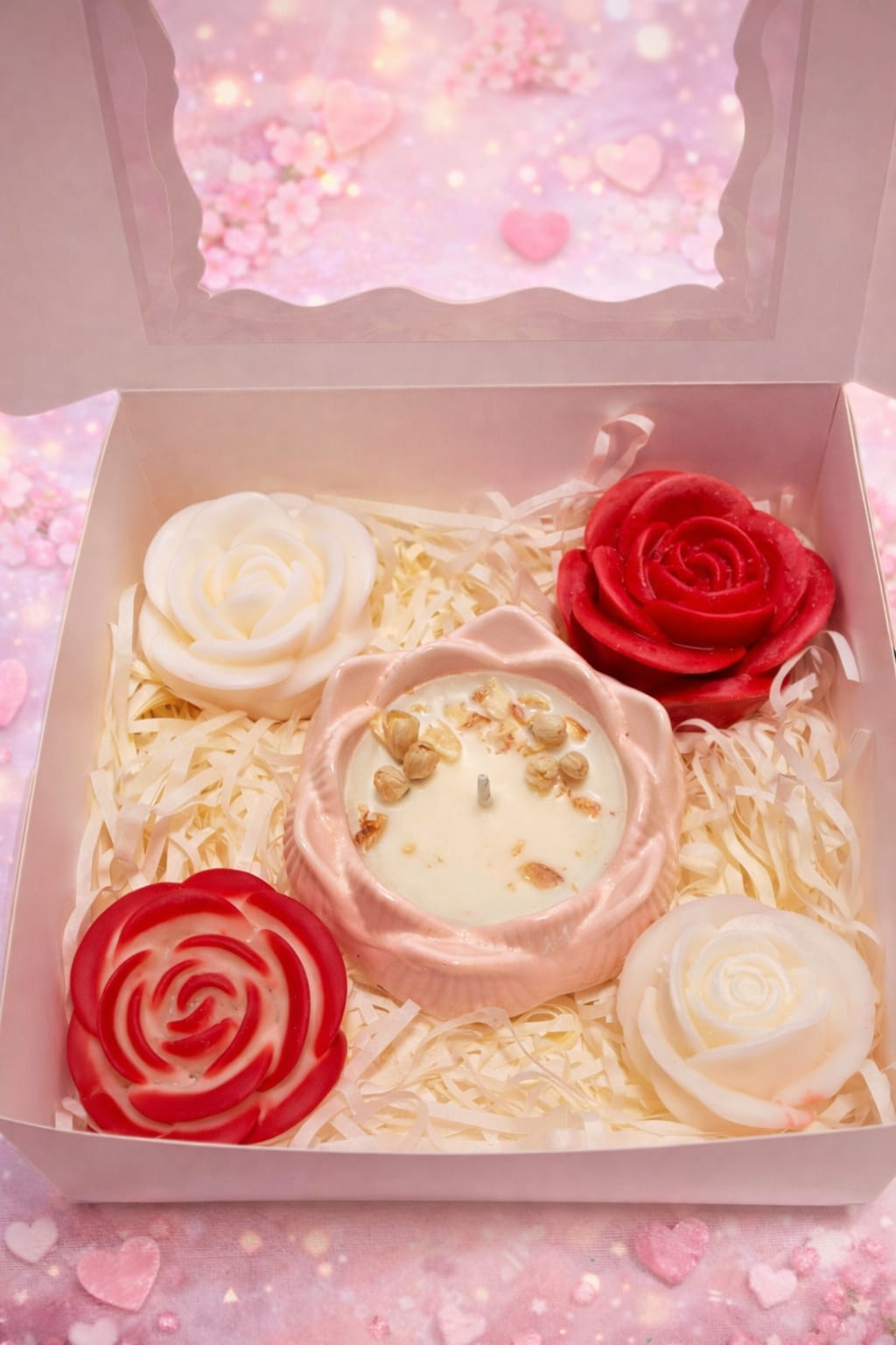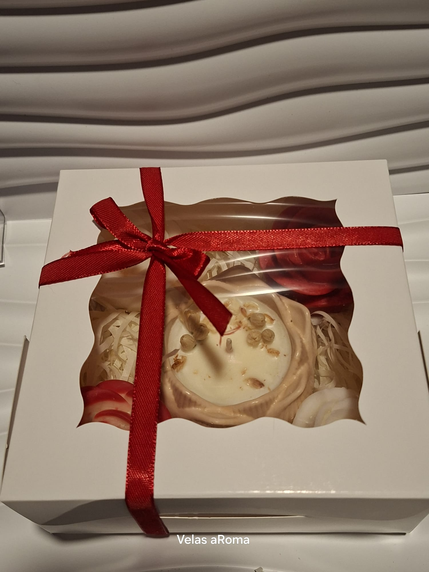 Pack artesanal con 1 vela aromática y 4 wax melts en forma de rosa, ideal para regalar y crear una experiencia de aromas única y especial.