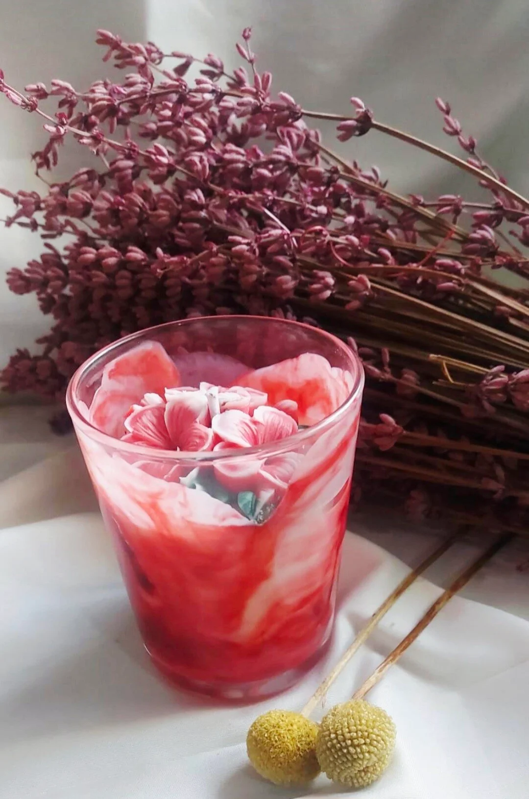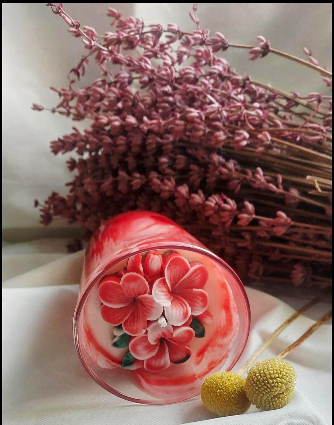 Vela Rosa Marmoleada elaborada a mano con cera de soja natural y fragancias premium. Su diseño artesanal combina tonos rosados suaves y efecto marmoleado, creando una pieza elegante y decorativa.