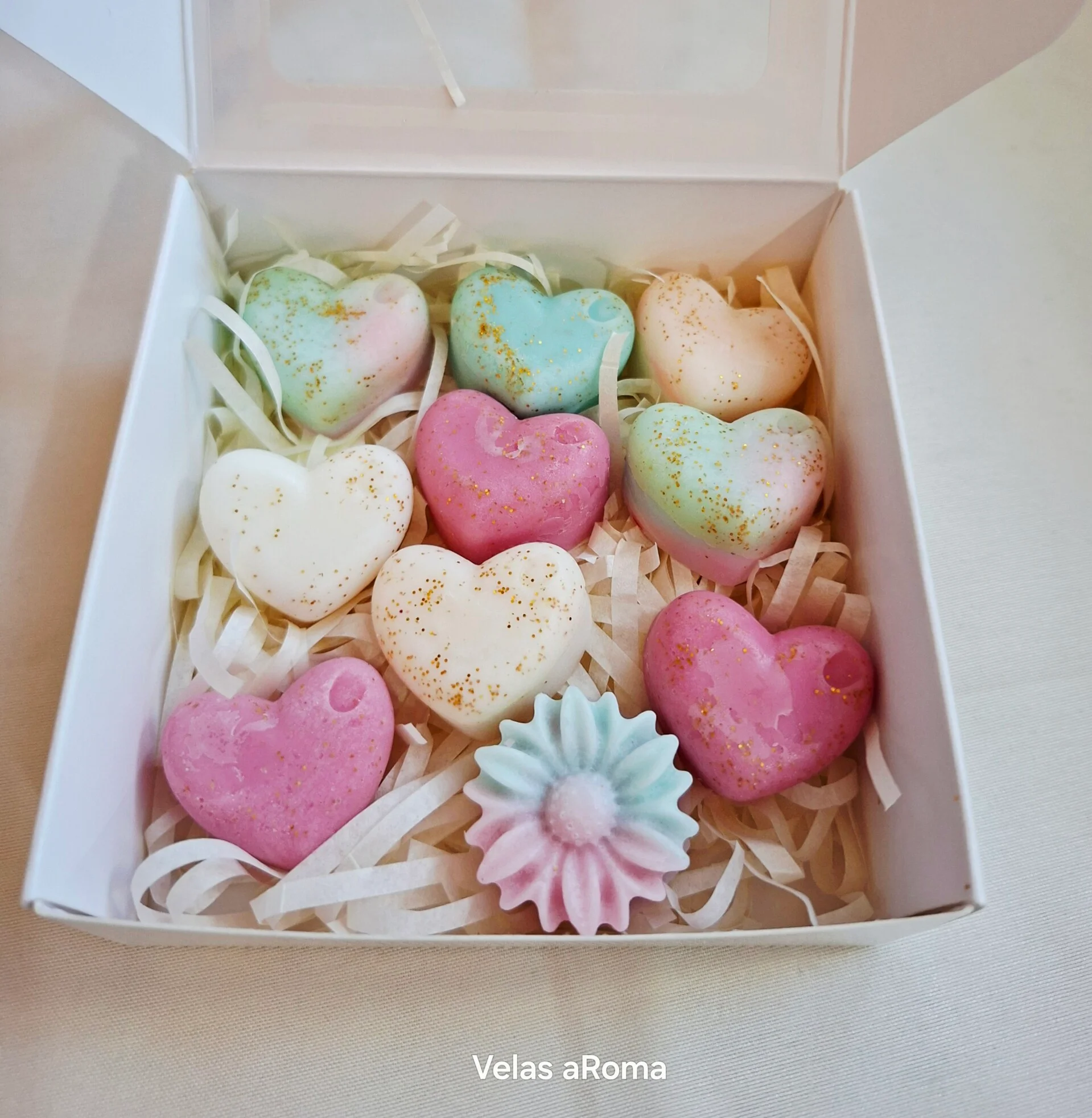 ???? Una delicada selección de wax melts artesanales en forma de corazón, elaborados con cera de soja natural y decorados con un toque de brillo dorado.